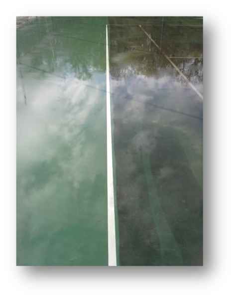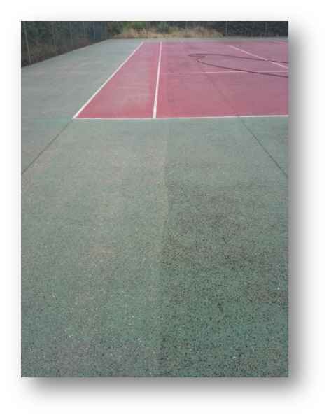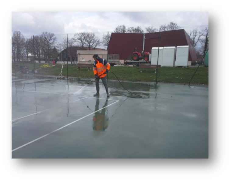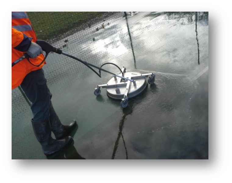 Les terrains de tennis en béton poreux et en résine sont des revêtements sur lesquels la mousse a tendance à s’implanter via l’humidité. Pour maintenir ces surfaces saines, il est nécessaire de les nettoyer annuellement pour éviter que la mousse s’incruste profondément dans les interstices du revêtement. L’utilisation d’un produit non toxique permet d’assécher les mousses et de rendre le nettoyage plus simple, pour ne pas dégrader le revêtement avec une trop forte pression. La cloche de nettoyage, avec des buses spécifiques, permet de désincruster les mousses facilement. L’aspiration des déchets et des eaux permet de ne pas laisser de traces pendant le nettoyage et après le séchage.