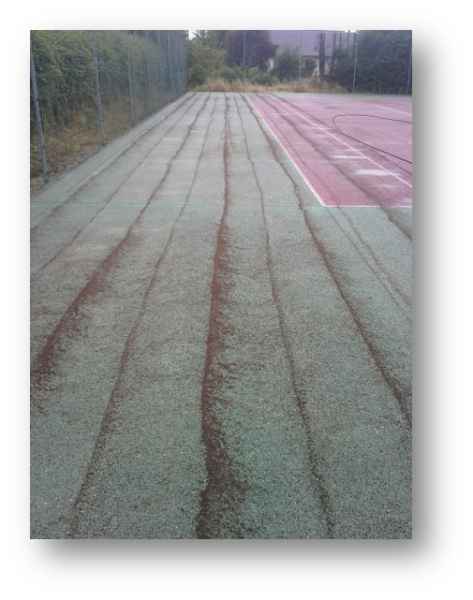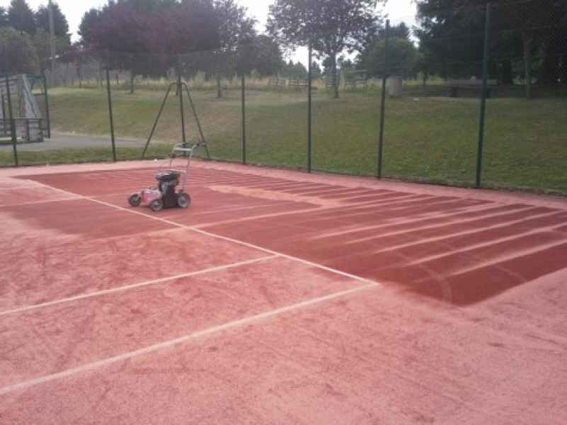 Les terrains de tennis en moquette synthétique ou aiguilletée sont des revêtements remplis avec du sable, de la brique pilée ou encore avec des matériaux plastiques (SBR, EPDM, …). Pour une bonne jouabilité, il est impératif que les terrains répondent aux exigences des utilisateurs. En décompactant le remplissage, puis en le purifiant, les capacités du revêtement synthétique seront recouvrées. Un sol compact ne laissera pas l’eau s’infiltrer. Des zones, dites de glaçage (flaque d’eau), se développeront sur les fonds de court et altèreront le jeu. Un apport de matière peut également être nécessaire lorsque les courts subissent une forte utilisation. Le remplissage permet la glissance du joueur (effet terre battue) mais il protège le revêtement contre l’usure prématurée.